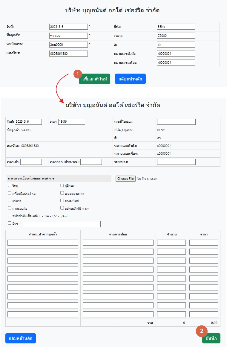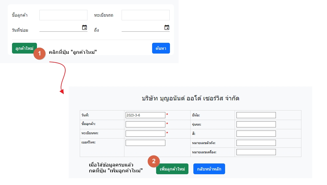 1. เมื่่อกดปุ่มเพิ่มลูกค้า ระบบจะไปสู่หน้าเพิ่มรายการซ่อมบำรุง 2. ทำการกรอกข้อมูลการ เรียบร้อยแล้วให้กดปุ่มบันทึก |