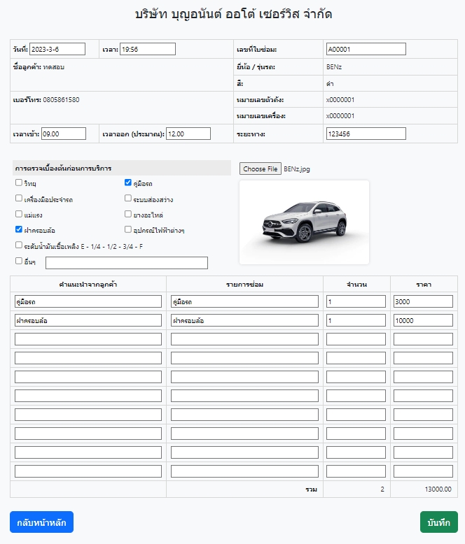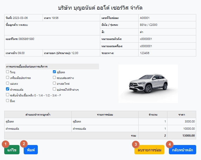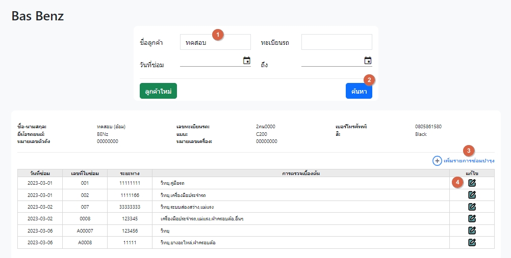 1. สามารถกรอก ชื่อลูกค้า, ทะเบียนรถ หรือ วันที่ซ่อม 2. เมื่อกรอกคำค้นหาแล้วให้กดปุ่ม "ค้นหา" 3. ถ้าต้องการเพิ่มรายการซ่อม สำหรับลูกค้าเดิม "+ เพิ่มรายการซ่อมบำรุง" 4. สามารถเข้าดูรายการซ่อมได้ |