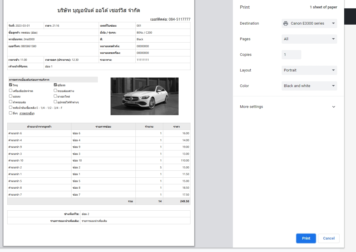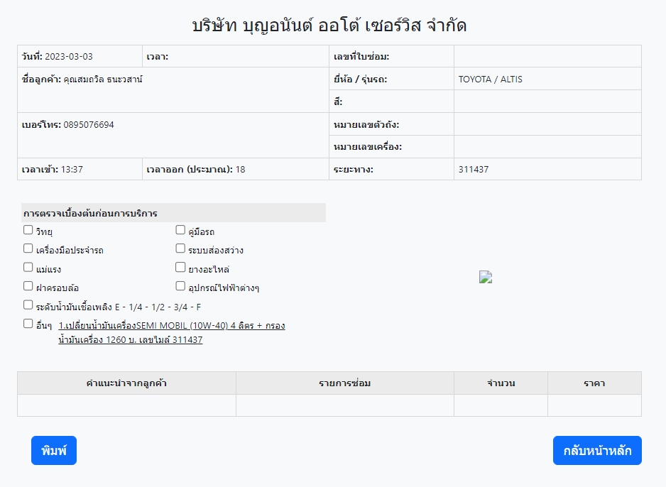 | ตัวอย่างการพิมพ์รายการซ่อม |